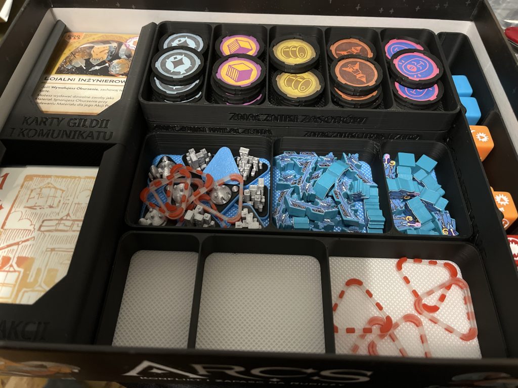 Insert dobrze zaprojektowany, nawet przy pionowym ułożeniu gry nic nie wypada. Gniazda na karty dostosowane do koszulek. Protektory na żetony bardzo ładnie się prezentują i spełniają swoją funkcję jednocześnie.